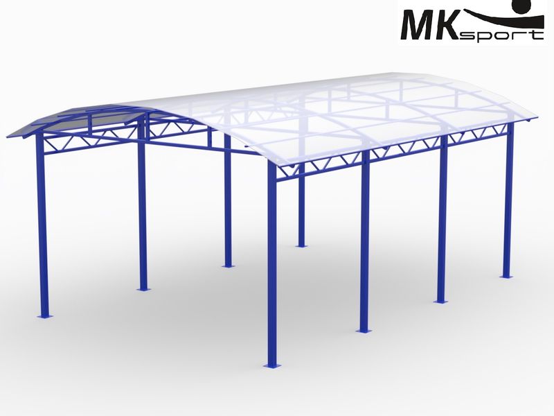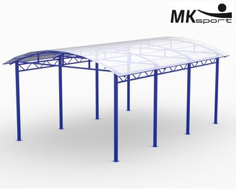 Арочная форма крыши является наиболее практичным вариантом навеса для уличных спортивных площадок: вода и снег не будут скапливаться на ней и приводить к деформации каркаса. Для производства козырька используется сотовый поликарбонат 8 мм, способный выдержать большие снежные нагрузки. Крепление навеса на металлокаркас осуществляется с помощью болтов. Конструкция обработана цинкосодержащим грунтом, устойчивым к коррозии, и покрыта полимерной порошковой краской, не выгорающей на солнце. Сборно-разборная конструкция существенно упрощает процесс доставки оборудования к месту монтажа.