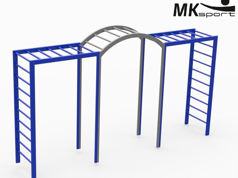 Две горизонтальные и одна дугообразная лестница образуют снаряд, который может использоваться людьми с любым уровнем физической подготовки: профессиональными и непрофессиональными спортсменами. Опоры рукохода выполнены из толстостенного профиля, что является гарантией прочности и устойчивости конструкции. Перекладины из труб малого диаметра обеспечивают удобство хвата и выполнения упражнения. Металлическая конструкция обработана цинкосодержащим грунтом и покрыта полимерной порошковой краской.
