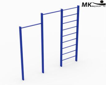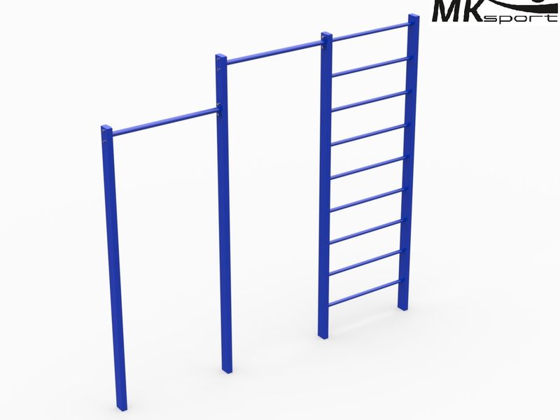 Шведская стенка с турником – компактный и универсальный снаряд, который может использоваться для разминки, растяжки, тренировки мышц рук, спины, плечевого пояса и пресса. Данная модель предполагает наличие двух турников, перекладины которых расположены на разных уровнях – 2 и 2,3 м. Опорные столбы изготовлены из профильных труб 80*40*3, перекладины шведской стенки и турников из круглых труб 27*3 и 32*3 мм. Стандартный цвет комплекса синий.
