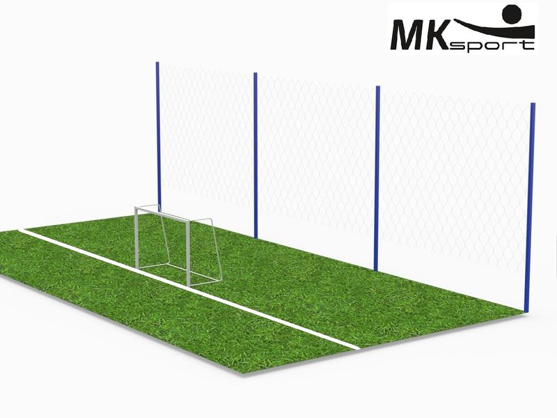 Опоры для натяжения заградительной сетки за футбольными воротами устанавливаются на открытых спортивных площадках путем бетонирования в грунт. Высота опор после бетонирования на 1 метр составляет 5 метров над уровнем поля. Столбы для заградительной сетки выполнены из профильной трубы 100*100*3 мм. Набор креплений для фиксации сетки входит в стандартную комплектацию. Цвет опор синий.